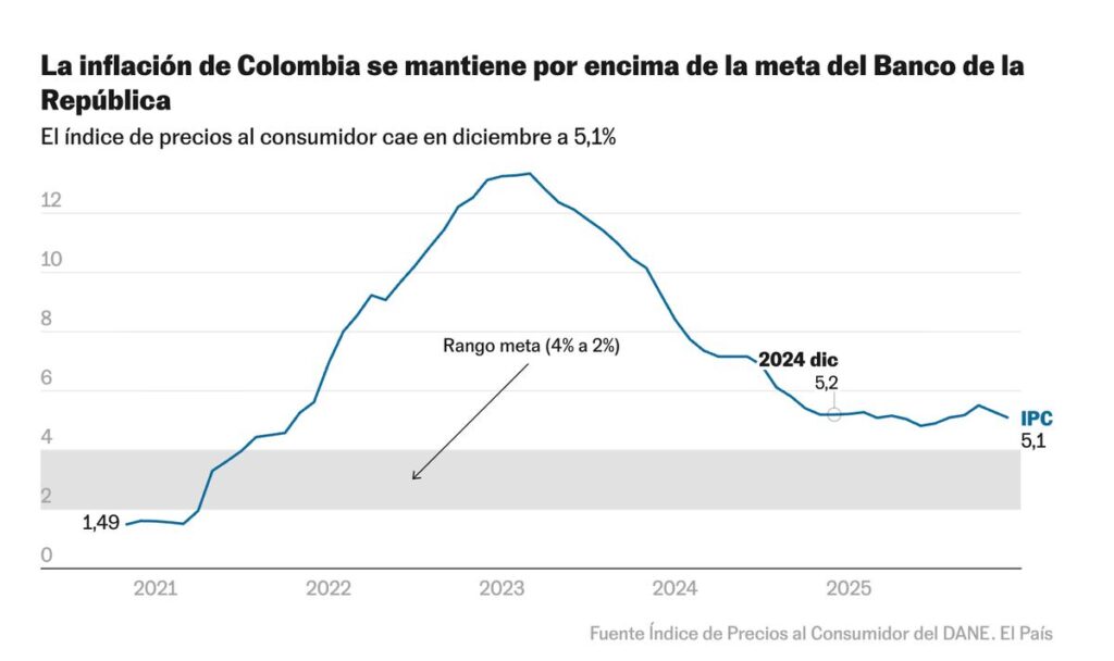 La inflación en Colombia ha finalizado 2025 con una variación anual del 5,1%, un dato que se mantiene casi idéntico al del año anterior, según ha confirmado el Departamento Administrativo Nacional de Estadística (DANE). Este resultado subraya un año crítico en la lucha contra el aumento de precios de bienes y servicios, especialmente teniendo en cuenta que el Banco de la República había proyectado un cierre del 4,4%. Este es el quinto año consecutivo en que Colombia no alcanza su meta del 3% de inflación, posicionándose detrás de otros países de América Latina que han mostrado mejores indicadores en este aspecto.