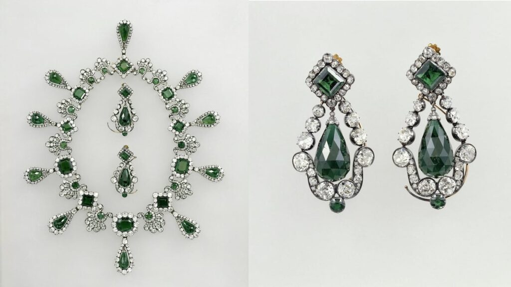 El conjunto de joyas robadas tiene una rica historia que se remonta a 1810, cuando Napoleón I encargó al joyero de la corte, François-Régnault Nitot, un regalo para su nueva esposa, María Luisa de Austria. Originalmente, la colección incluía más piezas, pero estas se dispersaron en el siglo XX. Tras el regreso de María Luisa a Austria tras la caída del imperio, conservó las esmeraldas que acabaron en manos del Gran Duque Leopoldo II de Toscana. La firma Van Cleef & Arpels adquirió el conjunto en 1953, vendiendo las esmeraldas de la tiara de manera dispersa. Finalmente, el collar y los pendientes fueron adquiridos por el Louvre en 2004.